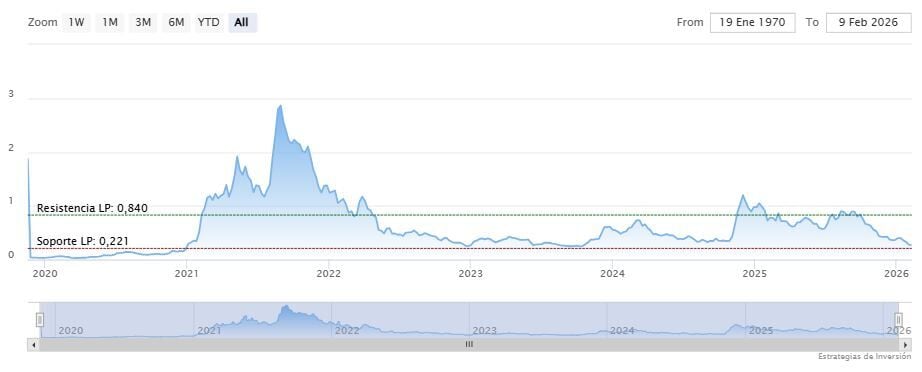 El soporte a mediano y largo plazo se encuentra en los 0.22 dólares. Mientras, los indicadores de Ei se muestran prácticamente bajistas.