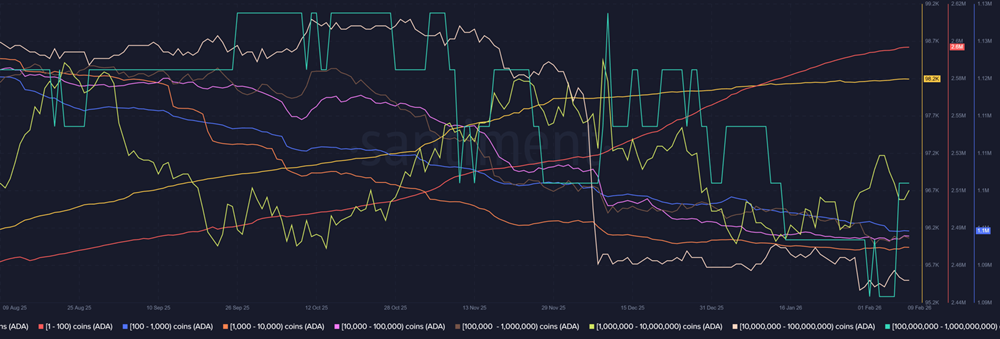 La distribución de la oferta de Cardano mostró que solo los pequeños tenedores con menos de 100 $ADA estaban acumulando. La mayoría de los demás grupos han estado vendiendo desde noviembre, como se refleja en la disminución del número de direcciones en esos rangos. La única excepción fue el grupo de $ADA de 1 a 10 millones de dólares.