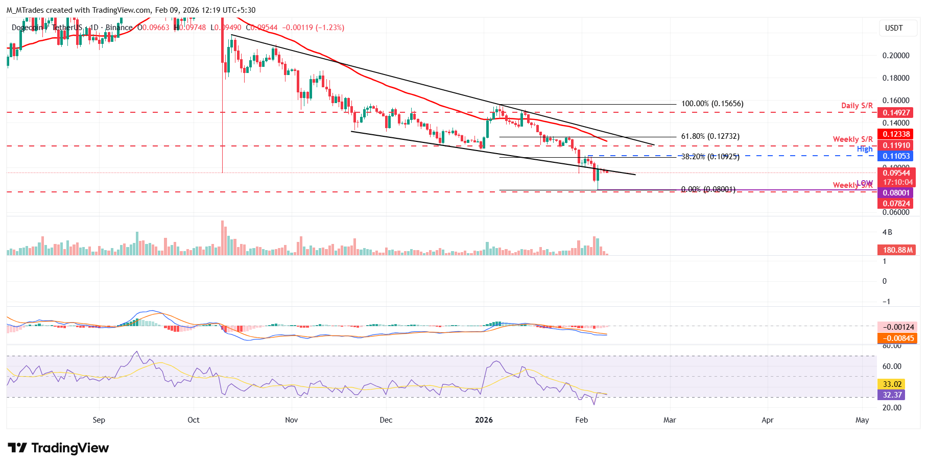 Si $DOGE reanuda su tendencia bajista en curso, podría caer hacia el mínimo del viernes de 0.080$. Un cierre por debajo de este nivel podría extender las pérdidas hacia el siguiente soporte semanal en 0.078$.