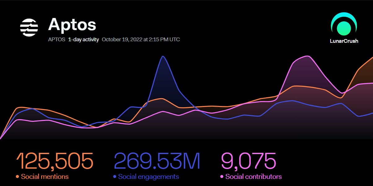 Details show a tremendous increase in Apto’s social activity in less than 24 hours. Data from the Lunar Crush dashboard reveals over 9K contributors in Aptos’ social activity, indicating a 30,503% increase in the past 24 hours.