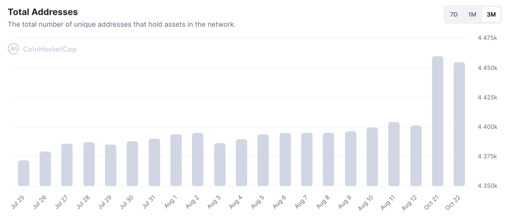Indeed, as of October 22, Dogecoin had 4,454,487 holders, representing a growth of about 2% from 4,365,551 holders registered on July 24. Overall, during the three months, the tenth-ranked cryptocurrency by market cap has added 88,936 holders, according to CoinMarketCap data.