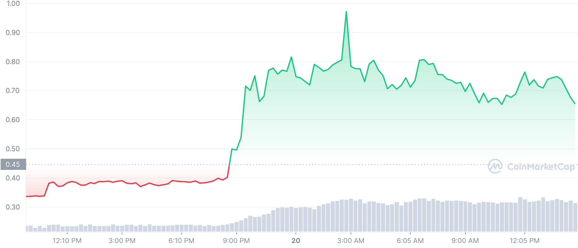 AURY, which is the token of the GameFi project Aurory based on the Solana blockchain, surged by nearly 250% in just a few hours yesterday. Since the "opening" of trading on the crypto market, the price of AURY has risen from $0.316 to $1.09 at the peak.