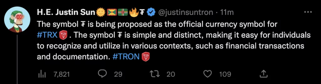 In his most recent tweet, Tron and Huobi Global Founder, H.E Justin Sun announced that his team are proposing the use of the symbol ₮ as the official currency symbol of $TRX.