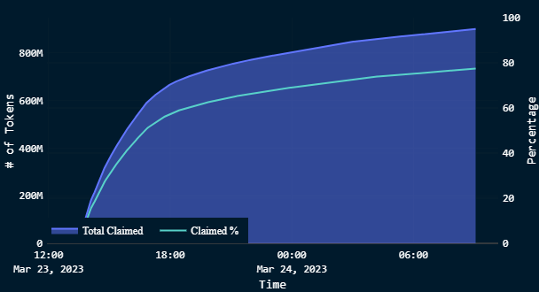 Blockchain analytical company Nansen Arbitrum’s airdrop dashboard shows that 476,553 addresses have claimed almost 900 million ARB tokens in the last 24 hours.