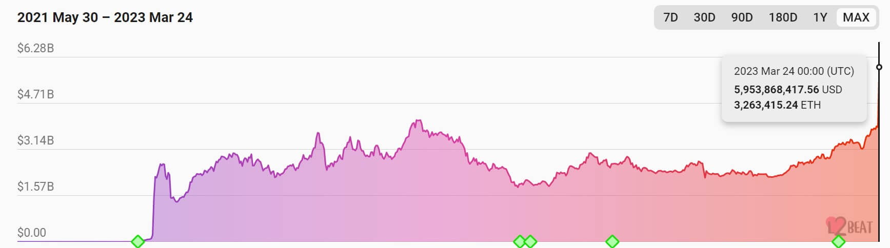 According to L2 beats data, the total value of assets locked (TVL) on Arbitrum has increased to $5.95 billion — up 62% from $3.90 billion recorded on March 23.