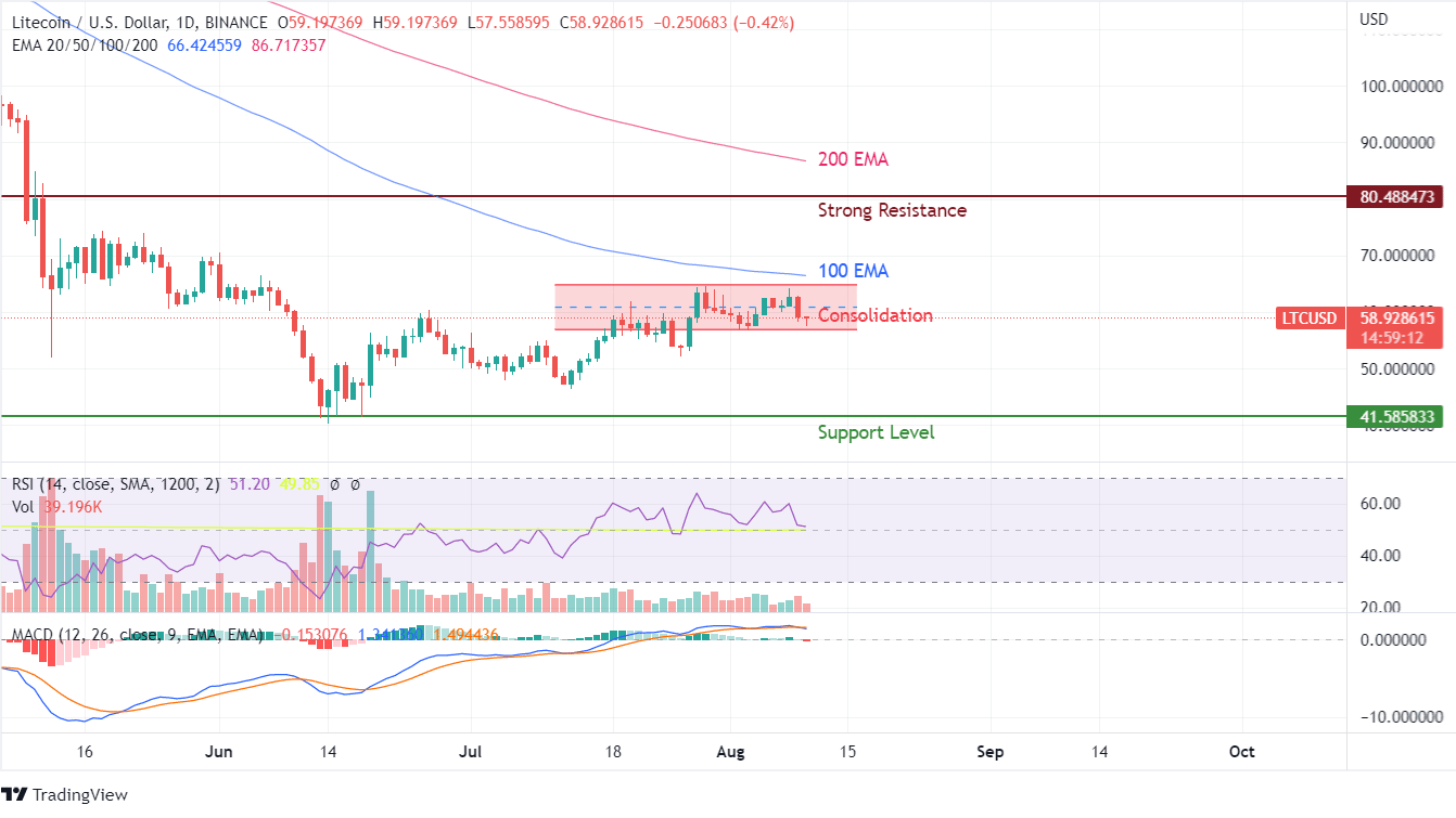 MACD has already created a bullish crossover, which is being maintained throughout the current consolidation, and profit bookings on Litecoin. Wicks’ formation indicates profit bookings, but holders might be in a safer zone as long as a bearish candle isn’t formed. Although RSI has taken a dip, it offers mixed sentiments about the possible price outlooks.