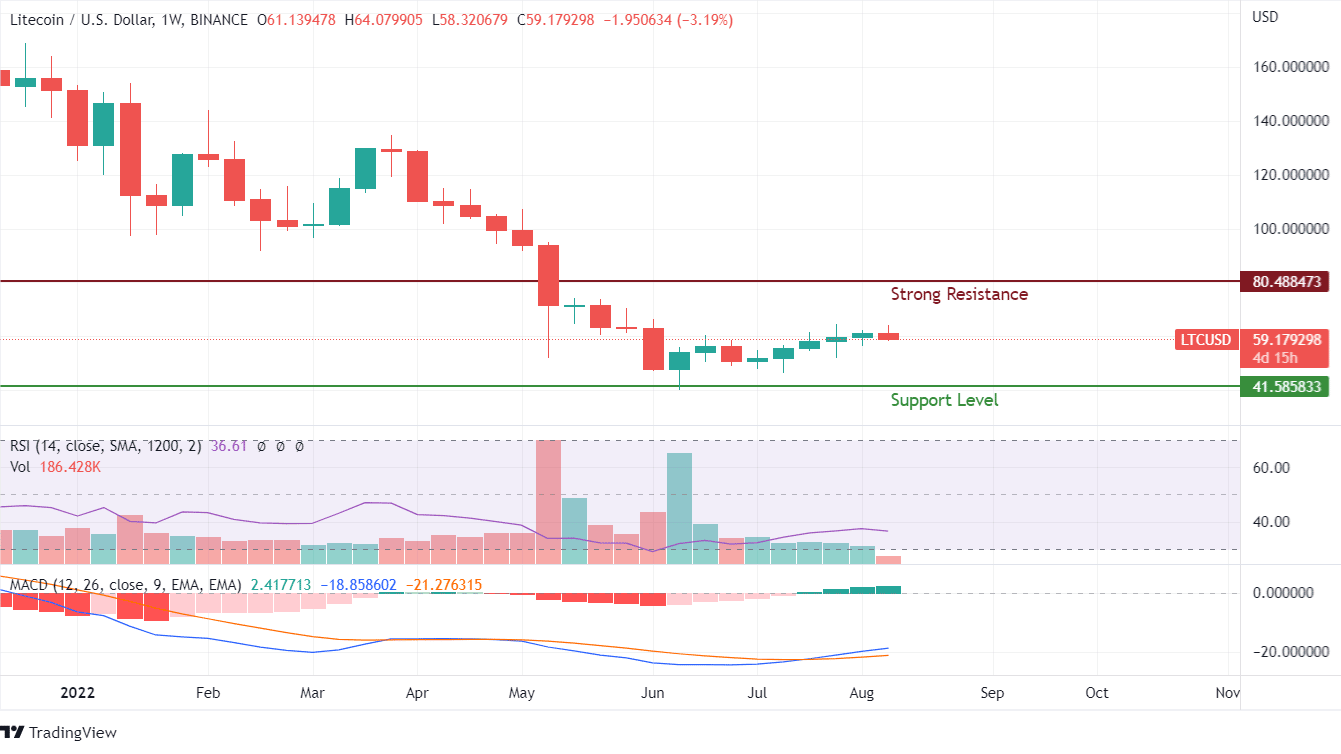 Weekly charts signify the failure of LTC in repeating previous positive streaks. Profit booking has become more stringent at higher levels of $65. The resistance level of daily charts affects even on the weekly charts with a positive outlook on long-term price action.