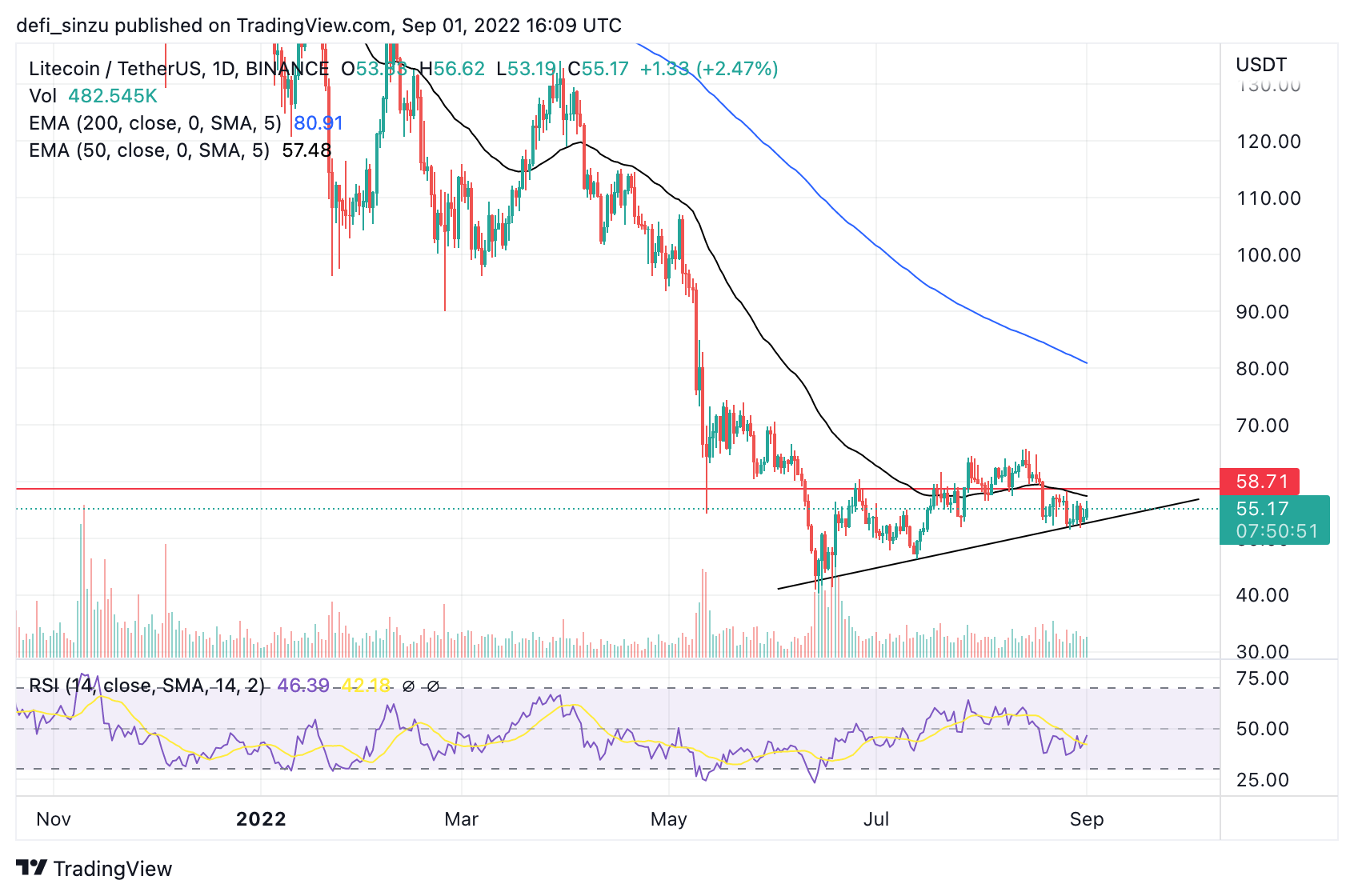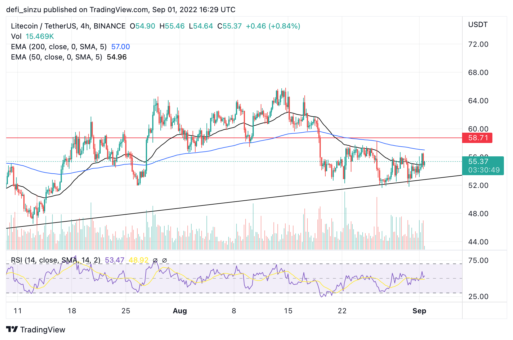 The 50 EMA corresponds to the price of $57, acting as a resistance for the price of LTC to trend higher. If the LTC price breaks and holds above the $57 corresponding to the 50 EMA, we could see the price trending higher to a region of $60, acting as another key support.