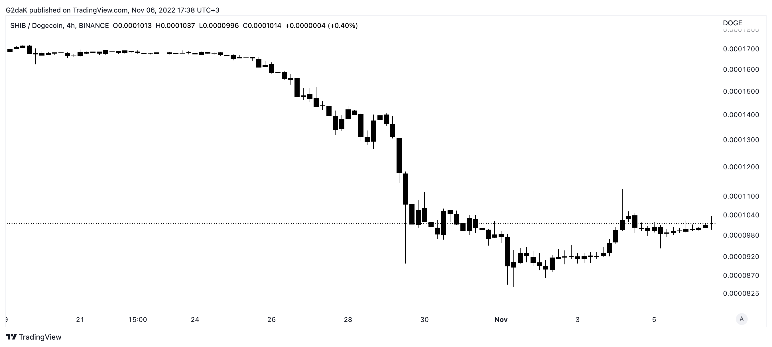 The main token of the Shiba Inu ecosystem, SHIB, has performed impressively against its main rival Dogecoin since midweek. Since Wednesday, Nov. 2, SHIB has gained 13% against DOGE, now trading at 0.0001 Dogecoin per Shiba Inu token.