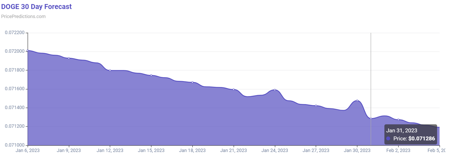 In this line, the machine learning algorithms at the crypto tracking platform PricePredictions 30-day forecast indicates that Dogecoin will trade at $0.071286 on January 31, 2023, a correction of about 1.7% from DOGE’s value at the time of publishing.