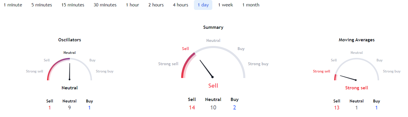 Elsewhere, the one-day gauges on TradingView are largely bearish for Dogecoin. The summary of the gauges is in the ‘sell’ zone at 14, while moving averages are for ‘strong sell’ at 13. Oscillators indicate ‘neutral’ at 9.
