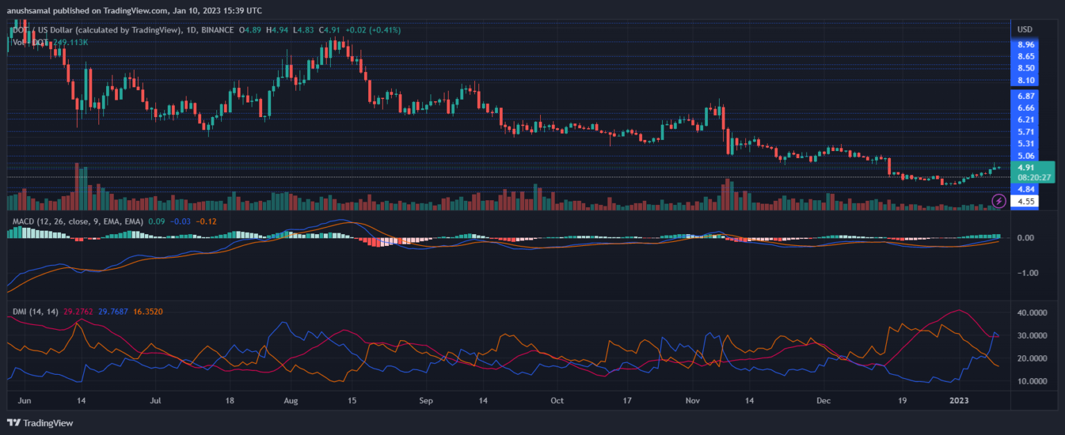 DOT was trading at $4.90 at press time. The $4.90 price level was a strong resistance point for the altcoin. Although DOT managed to break past the $4.80 resistance level, which has proven to be a tough resistance mark in the past, the coin continues to remain underneath the $5 level.