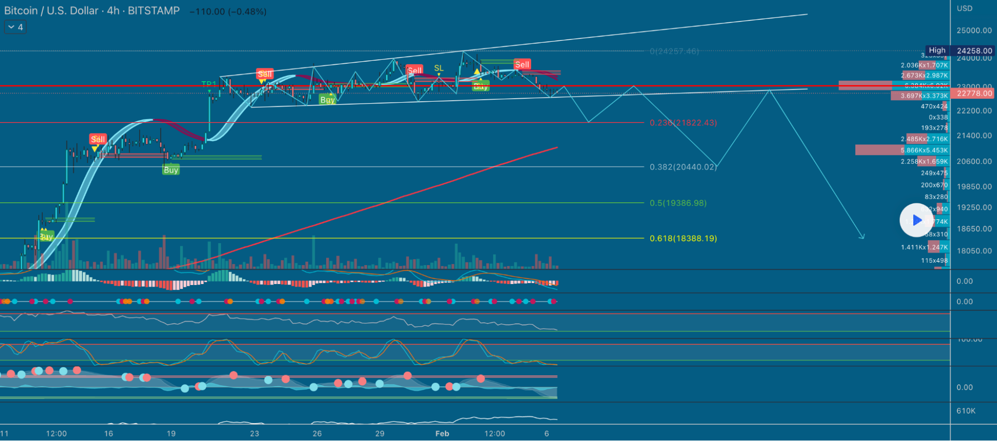 The BTC/USD 4HR chart via ankhramsiswmriimn is the first chart for analysis this Tuesday. At the time of writing, BTC’s price is trading between the 0.236 fibonacci level [$21,822.43] and the 0 fib level [$24,257.46].