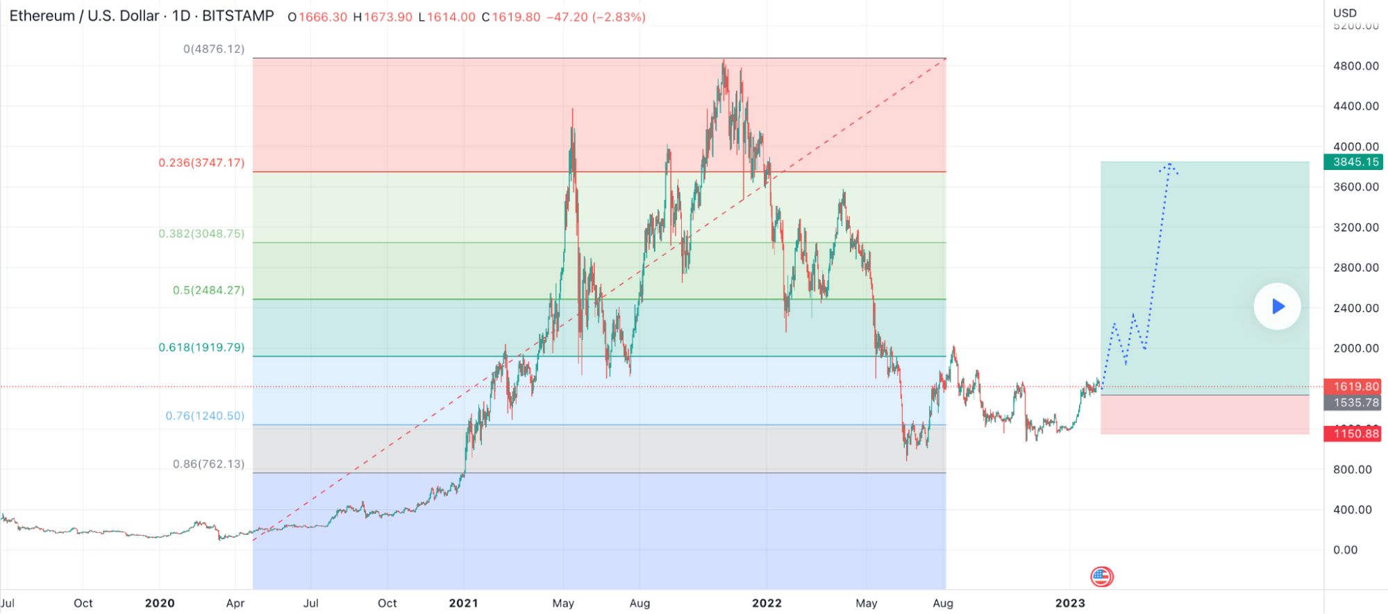 The second chart we’re examining today is the ETH/USD 1D chart below by holeyprofit. ETH’s price is trading between the 0.76 fibonacci level [$1,240.50] and the 0.618 fib level [$1,919.79], at the time of writing.