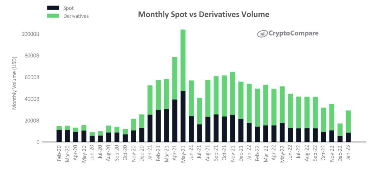 Trading activity grew strongly across the board in January, but derivatives volume grew faster than spot markets, according to data from CryptoCompare.