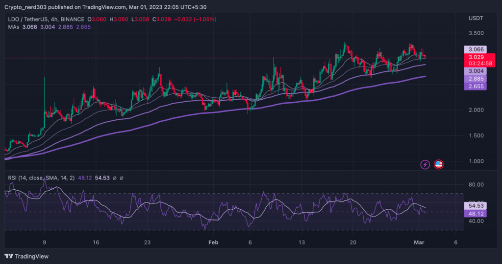 Lido price has been trending on an up trend since early Jan 2023 after breaking out of its bear trend with strong momentum. The lido price is currently taking support from the 50 EMA around $3.029 while its next major support is around 100 EMA at the price of $3.004 and its resistance is around $3.300. As of now according to the historical price action, the LDO price might start moving downwards 4% below 100 EMA.