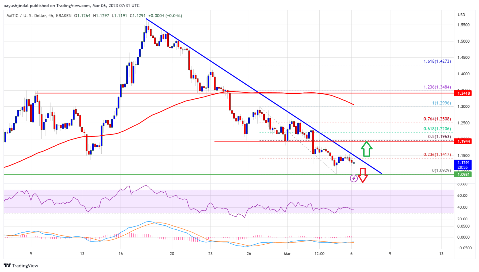 MATIC price is now facing resistance near the $1.15 level. There is also a major bearish trend line forming with resistance near $1.15 on the 4-hours chart of the MATIC/USD pair. The trend line is near the 23.6% Fib retracement level of the downward move from the $1.2996 swing high to $1.092 low.