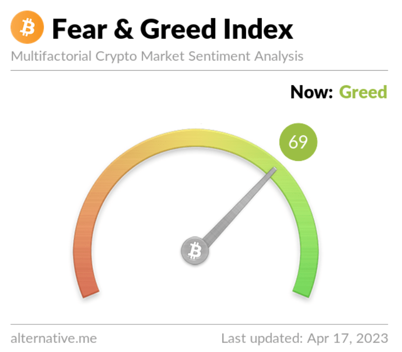 As it happens, the Fear & Greed index in the cryptocurrency sector is currently standing at 69, which is well into the ‘greed’ zone and the highest level since November 2021, when the crypto industry was in the middle of one of the largest bull runs since its inception, as per the alternative.me data retrieved by Finbold on April 17.