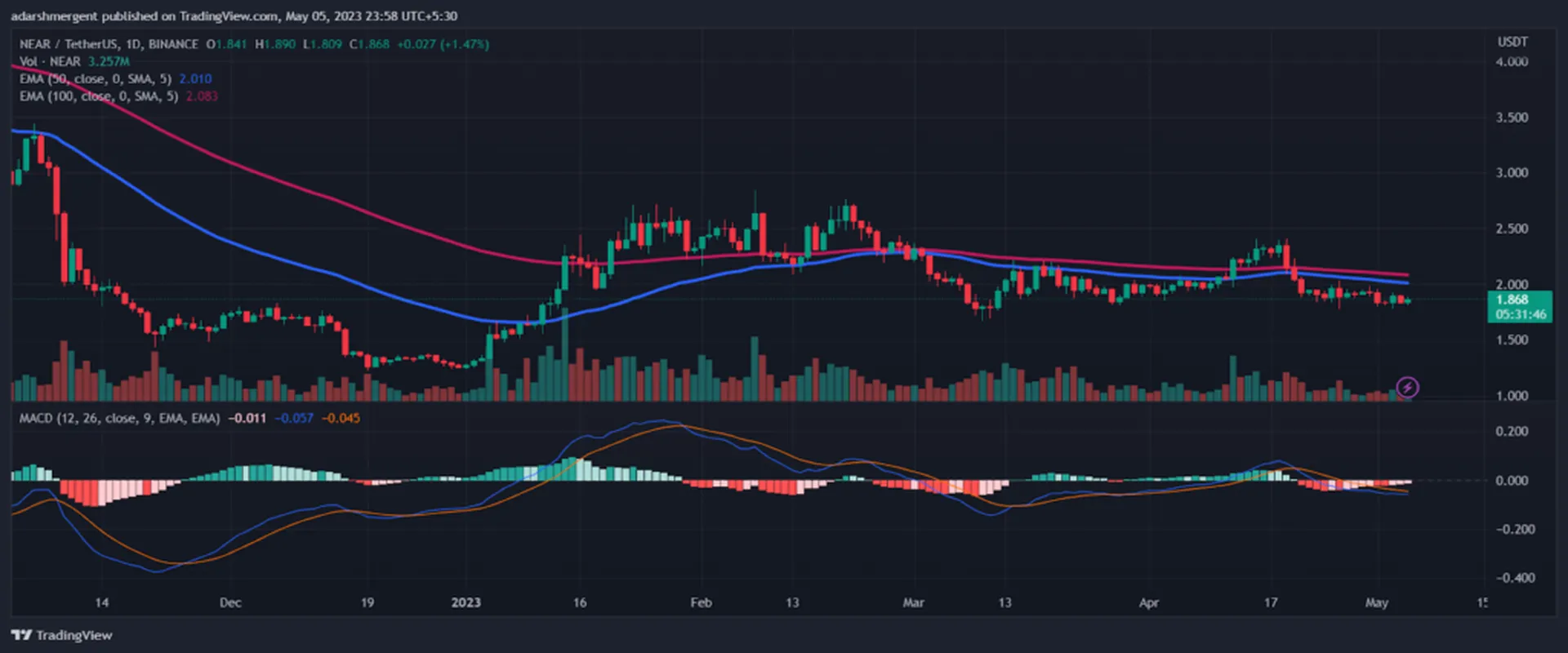The weekly technical chart of NEAR suggests a struggle between the bulls and bears. It has been moving in a consolidated zone on the daily chart. The daily chart is trading near the value of $1.82, with a small drop in the intraday session.