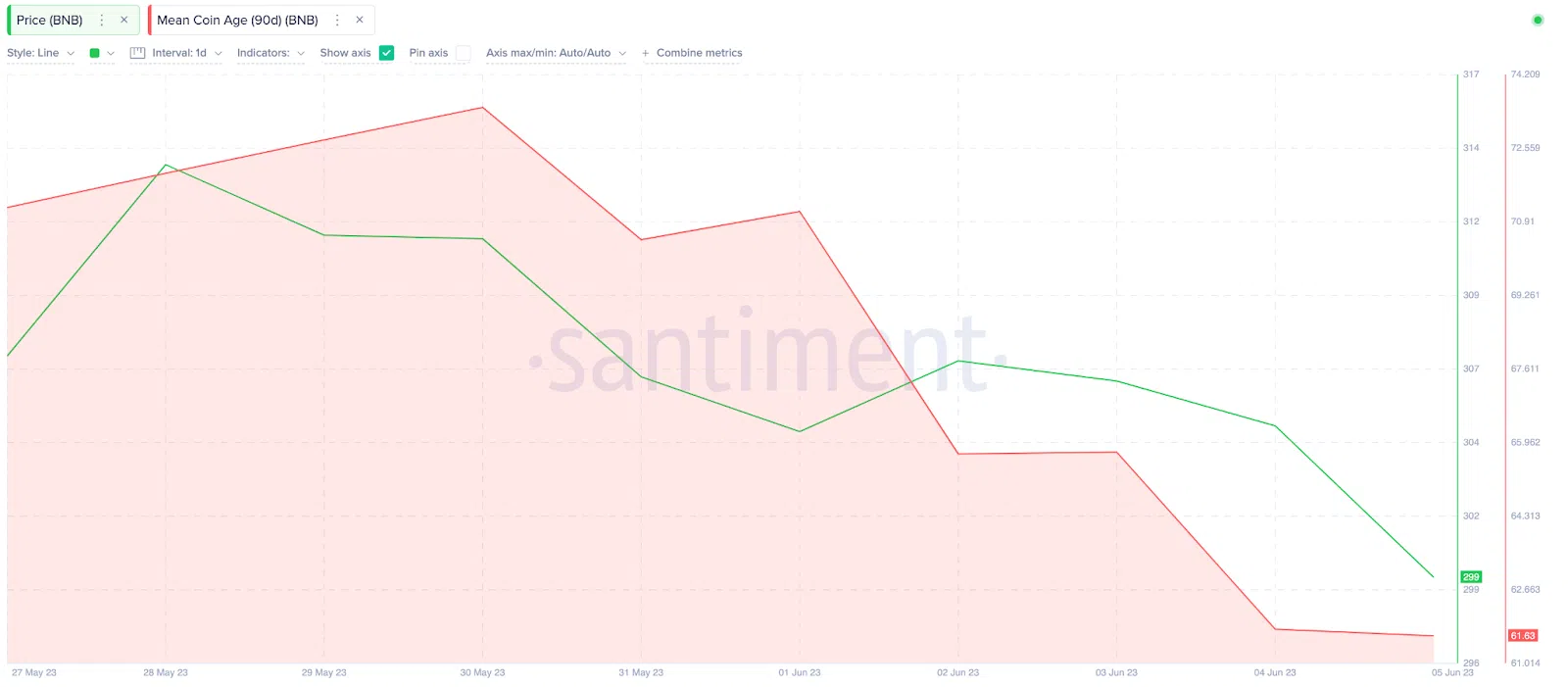 The Santiment chart below shows that long-term holders on the BNB chain began to offload their coins around May 30. Specifically, in the seven trading days between May 30 and June 5, BNB Mean Coin Age dropped 16% from 73.5 to 63.6.