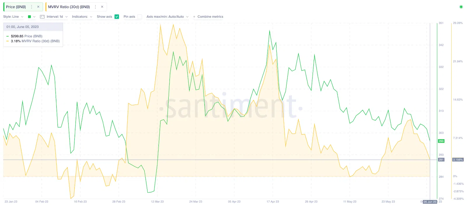 Santiment’s Market-Value to Realized-Value (MVRV) data indicates that despite the recent price drop of $300, most investors that bought BNB within the past month are still holding profits of around 3%.
