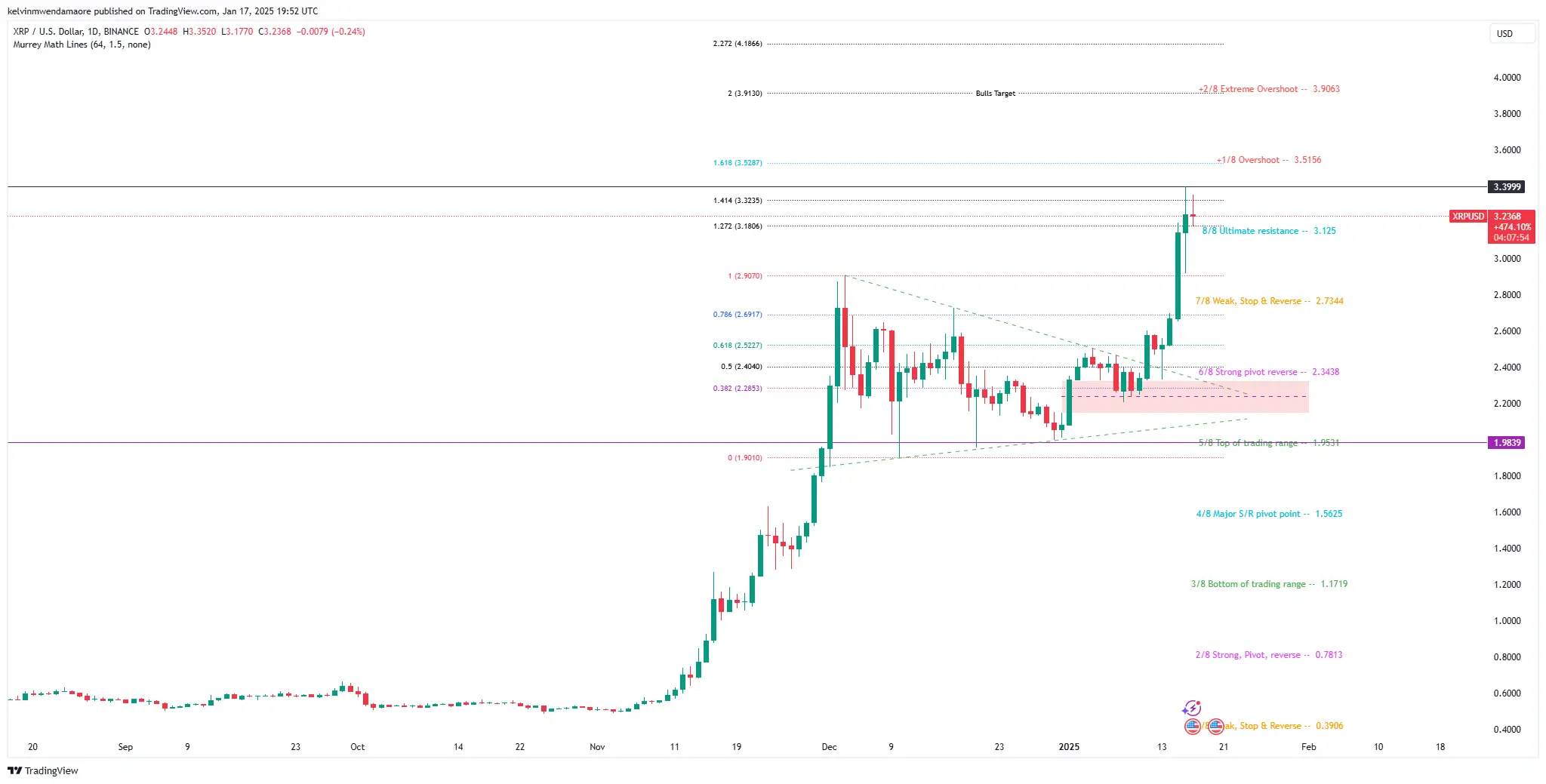 The token’s bullish momentum remains strong after breaking the $3.12 resistance, now acting as a key support level. The next primary target is $3.52 (1.618 Fibonacci level), with $3.91 as a key barrier if bullish sentiment persists. Support zones at $3.12, $2.73, and $2.34 offer key levels for traders to watch in case of corrections.