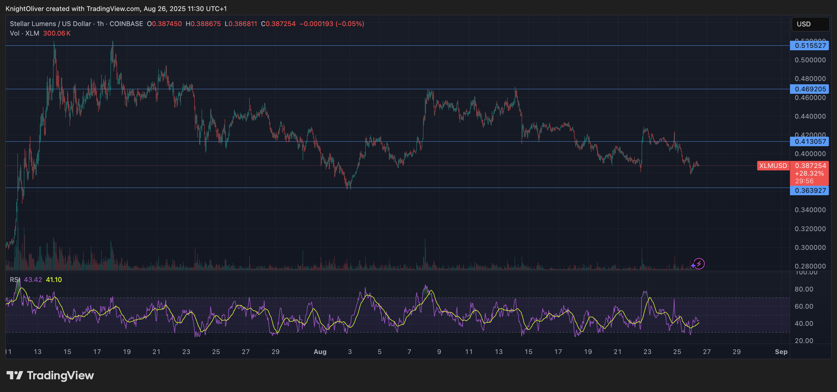 Intraday trading action highlighted this tension. Between 07:20 and 08:19 UTC on Aug. 26, XLM navigated a narrow band between $0.387 and $0.392, logging a modest 0.18% gain from its session open. The brief rally to $0.392 was powered by bursts of high-volume buying, but profit-taking capped momentum. With volumes surging 115% on the day to $402 million, the clash between heavy selling pressure and potential whale accumulation remains the defining narrative for Stellar’s near-term trajectory.