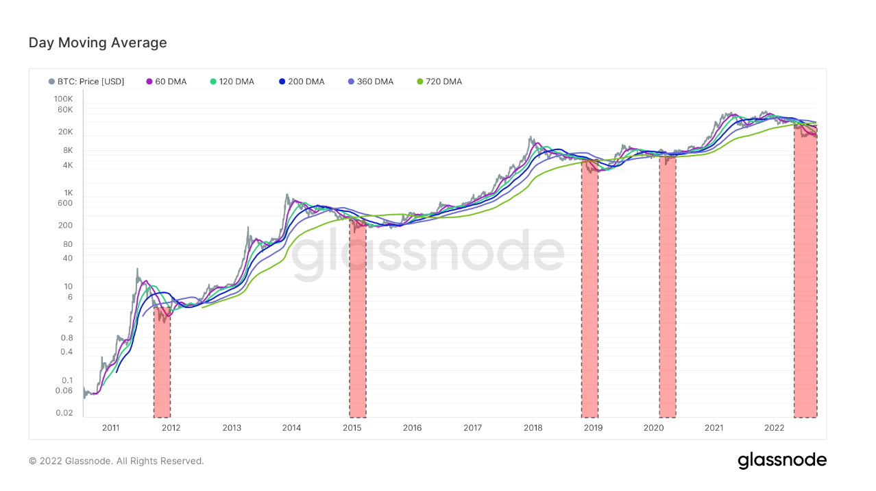 According to data from Glassnode, Bitcoin has fallen below all key moving averages for the fifth time ever. Bitcoin’s current stint below the moving averages is also the longest ever — coming in at almost twice as long as the previous drops we’ve seen at the end of 2011, 2015, 2019, and 2020.