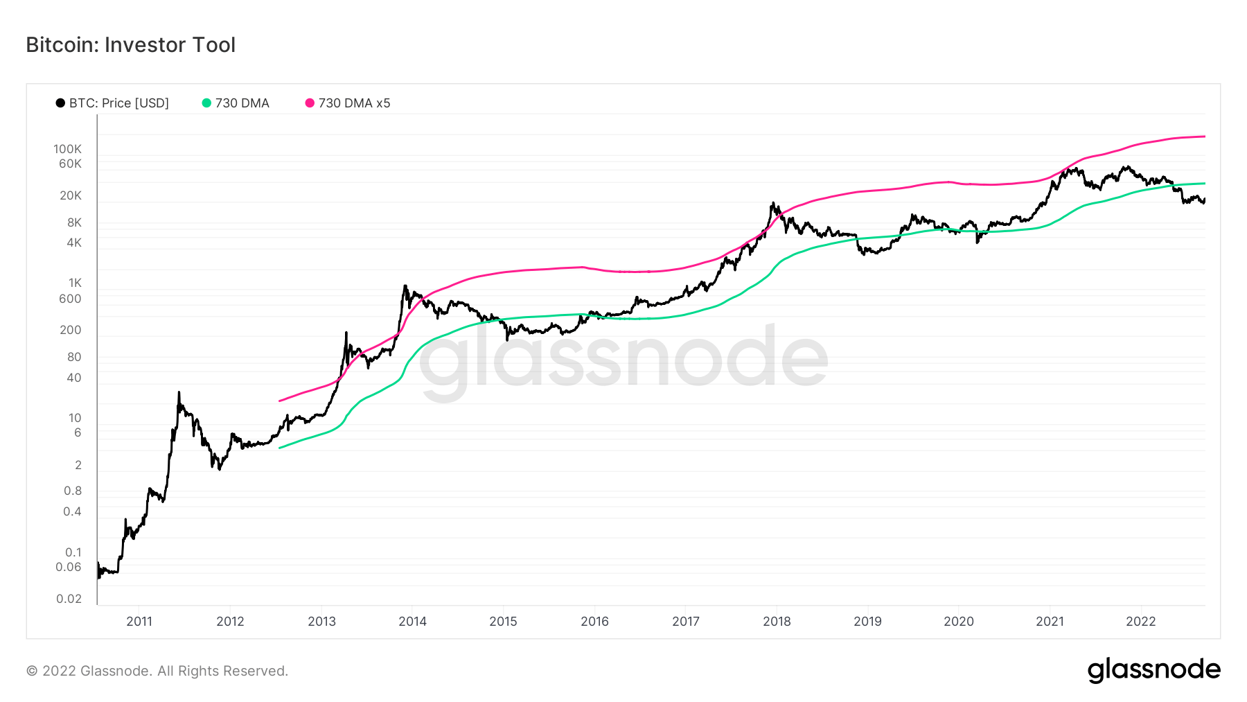 Moving averages are also part of other key indicators for determining the Bitcoin market cycle. One of those indicators is the Bitcoin Investor Tool, created by analyst Philip Swift. Intended as a tool for long-term investors, the indicator consists of two simple moving averages of Bitcoin’s price — the 2-year MA and a 5x multiple of the 2-year MA.