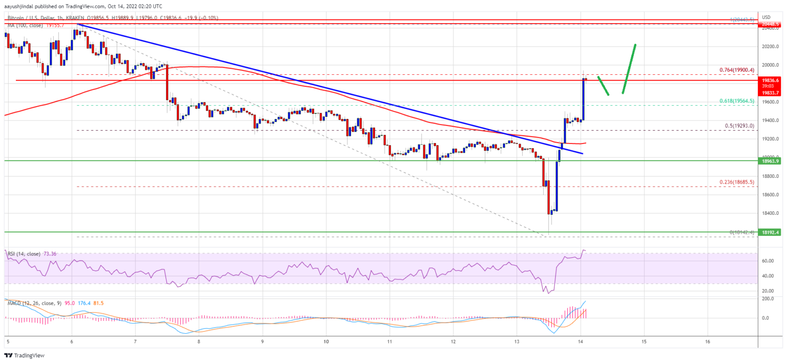 Bitcoin price cleared the 50% Fib retracement level of the downward move from the $20,443 swing high to $18,142 low. Besides, there was a break above a major bearish trend line with resistance near $19,150 on the hourly chart of the BTC/USD pair.