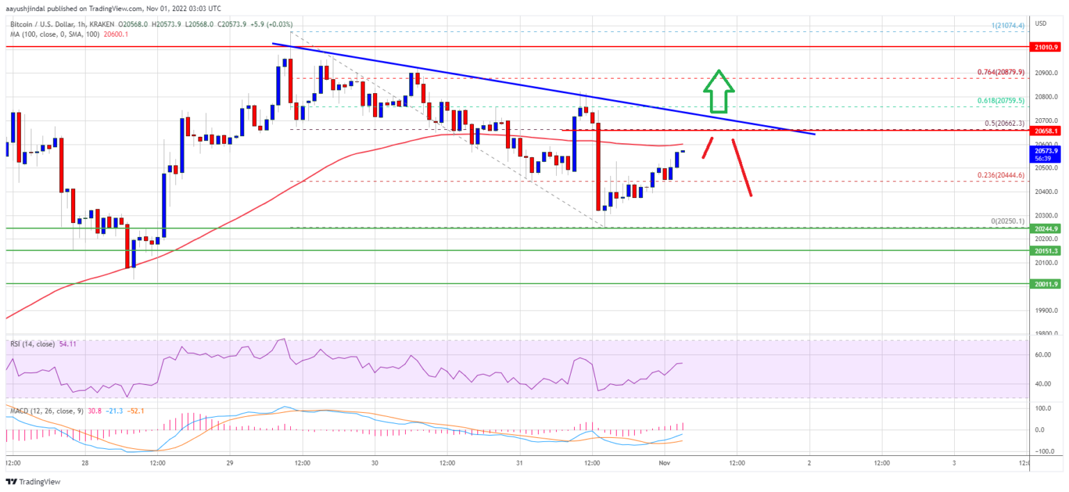 Bitcoin price started a downside correction below $20,500 against the US Dollar. BTC could start a fresh surge if it clears the 100 hourly SMA and then $21,000.