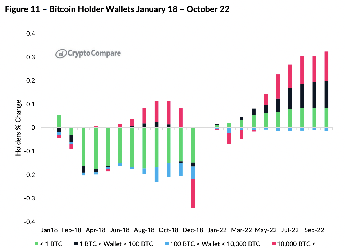 “As opposed to the last bear market, where all holders across different wallet sizes were panic-selling, in this bear market, we have seen a consistent accumulation in almost all accounts. Accounts above 10,000 Bitcoins have seen an increase which is likely due to increased institutional adoption.”