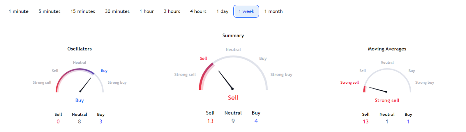 Meanwhile, the technical analysis (TA) one-week gauges are painting a somewhat different picture, as their summary is currently suggesting ‘sell’ at 13, as opposed to 4 indicating ‘buy’ and 9 for ‘neutral.’