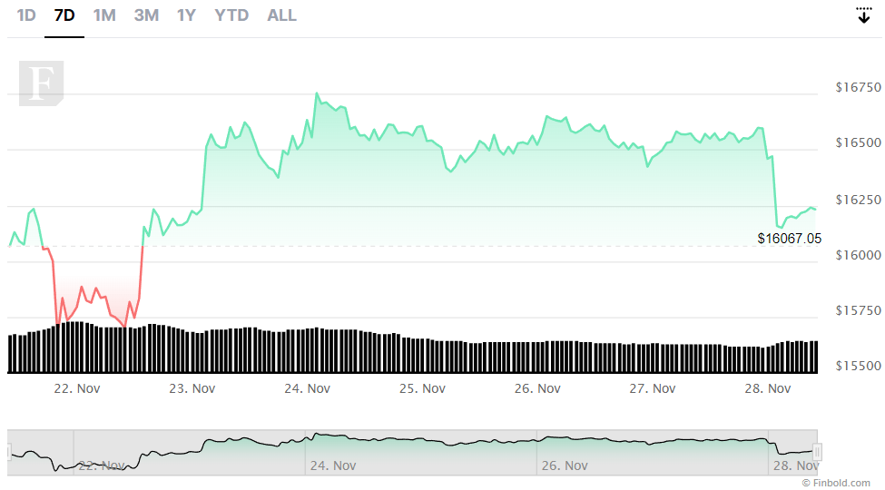 At press time, Bitcoin was changing hands at the price of $16,244, down 1.71% on the day but still recording a growth of 1.41% compared to the previous seven days, as per data retrieved on November 28.