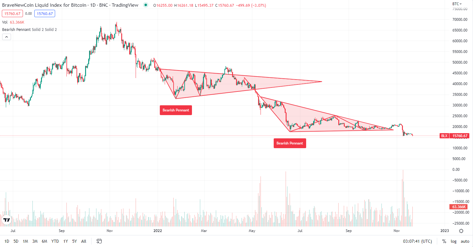 As shown above, there have been two major bearish pennants that have formed for the Bitcoin price in 2022, characterized by the lower tightening sideways movement of lower highs and higher lows. The first bearish pennant formed between January and May 2022, with a second one forming immediately after.