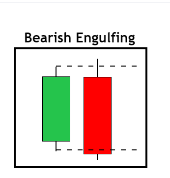 The larger candle engulfs and absorbs the smaller candle which implies that sellers have overtaken buyers and are pushing the price downwards more aggressively than the previous cycle of buyers pushing it up.