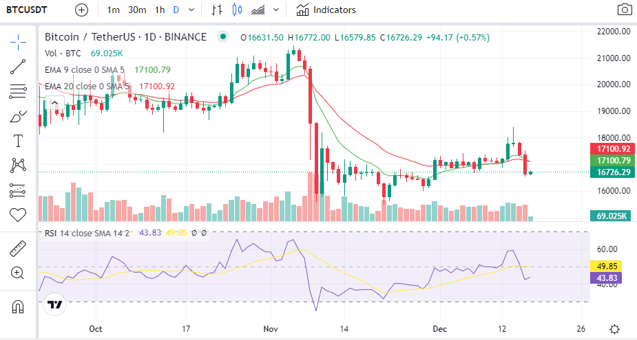 When looking at BTC’s performance over the last 24 hours, we see that the crypto king is currently trading at $16,751.00 after a 4.22% drop in price. In addition to this, the crypto is also still down by more than 2% over the last week.