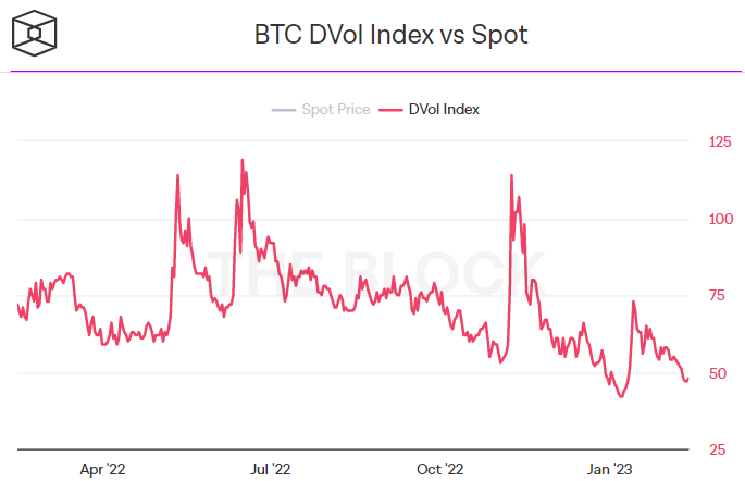 Deribit’s Bitcoin Volatility Index was at 48 on Monday, not far above the record lows it printed last month at 42 and well below mid-January highs of 73. Deribit’s Ethereum Volatility Index, meanwhile, was last at 62, just above its early January record lows around 58 and down sharply from recent mid-January highs above 80. Deribit is the dominant cryptocurrency derivatives exchange, accounting for around 95% of open interest across all Bitcoin and Ethereum derivative markets.