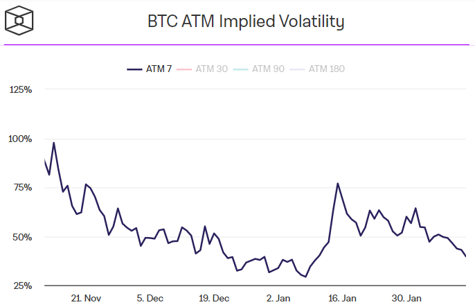 Despite looming US Consumer Price Index and Retail Sales data this week that could simultaneously inform expectations for the Fed’s tightening outlook and the outlook for a potential US recession later this year, Bitcoin’s 7-day Implied Volatility according to At-The-Money (ATM) options markets fell to 39.68% on Monday, its lowest in more than a month.