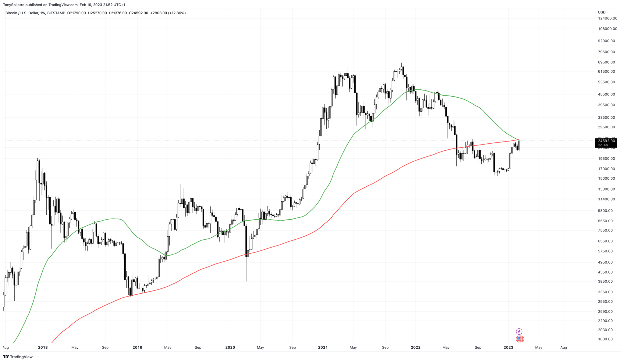 Bitcoin price briefly touched over $25,000 per coin today, before pulling back late in the day.The rally took Bitcoin price precisely to both the 50-week and 200-week moving averages that have recently “death crossed.”