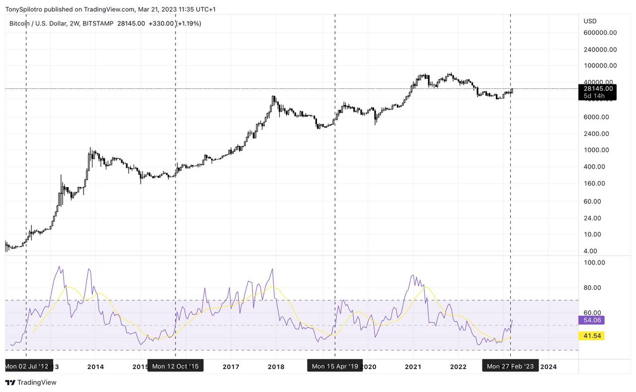 2W RSI is above 50, suggesting strength is increasing | BTCUSD on TradingView.com
