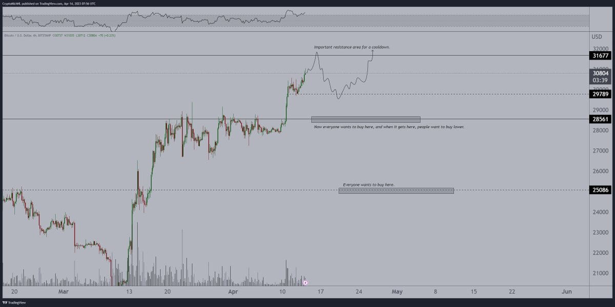 According to van de Poppe, one of the key resistance points to watch out for is $31,700 – $32,000. This level has proved to be a tough nut to crack for Bitcoin in the past, and it could be a significant obstacle to the digital currency’s upward momentum. With investors closely watching the market, the price may face some downward pressure at this level.
