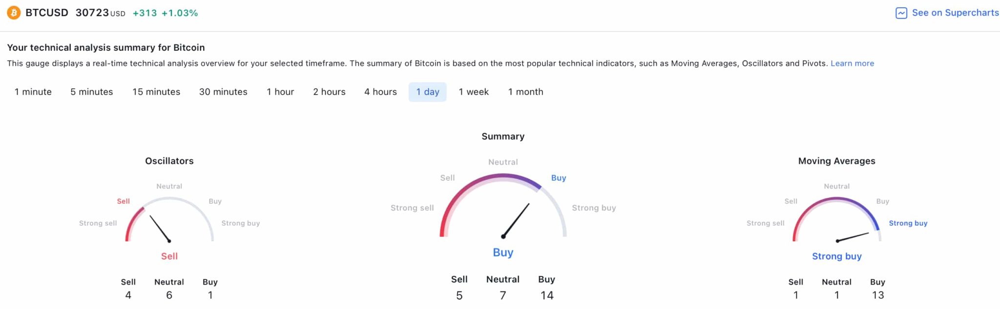 Bitcoin’s technical analysis (TA) on TradingView’s 1-day gauges are bullish; its summary aligns with the ‘buy’ sentiment at 14, resulting from oscillators pointing at ‘sell’ at 4 and moving averages (MA) indicating a ‘strong buy’ at 14.