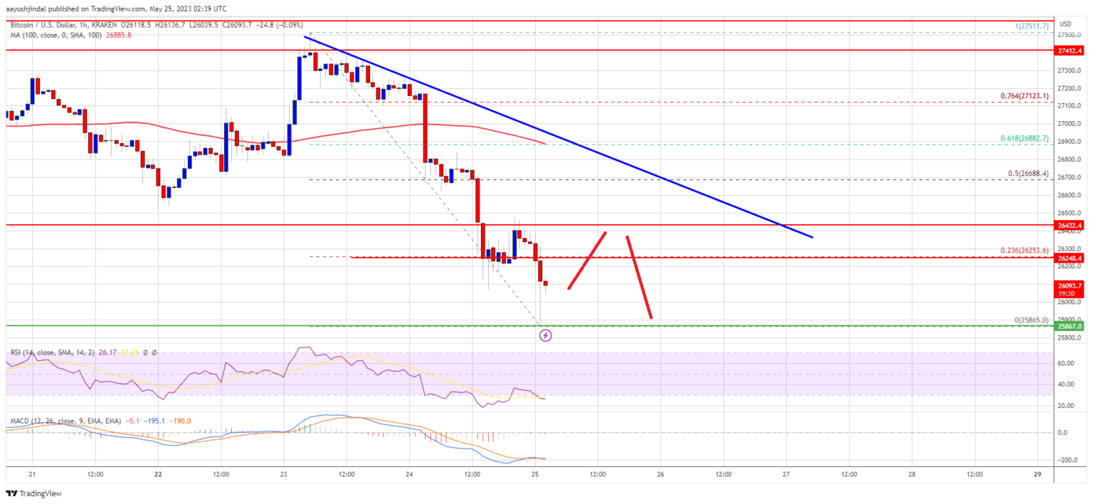 Bitcoin price is declining from the $27,500 resistance. BTC traded below $26,500 and now remains at risk of a drop toward the $25,500 support zone.