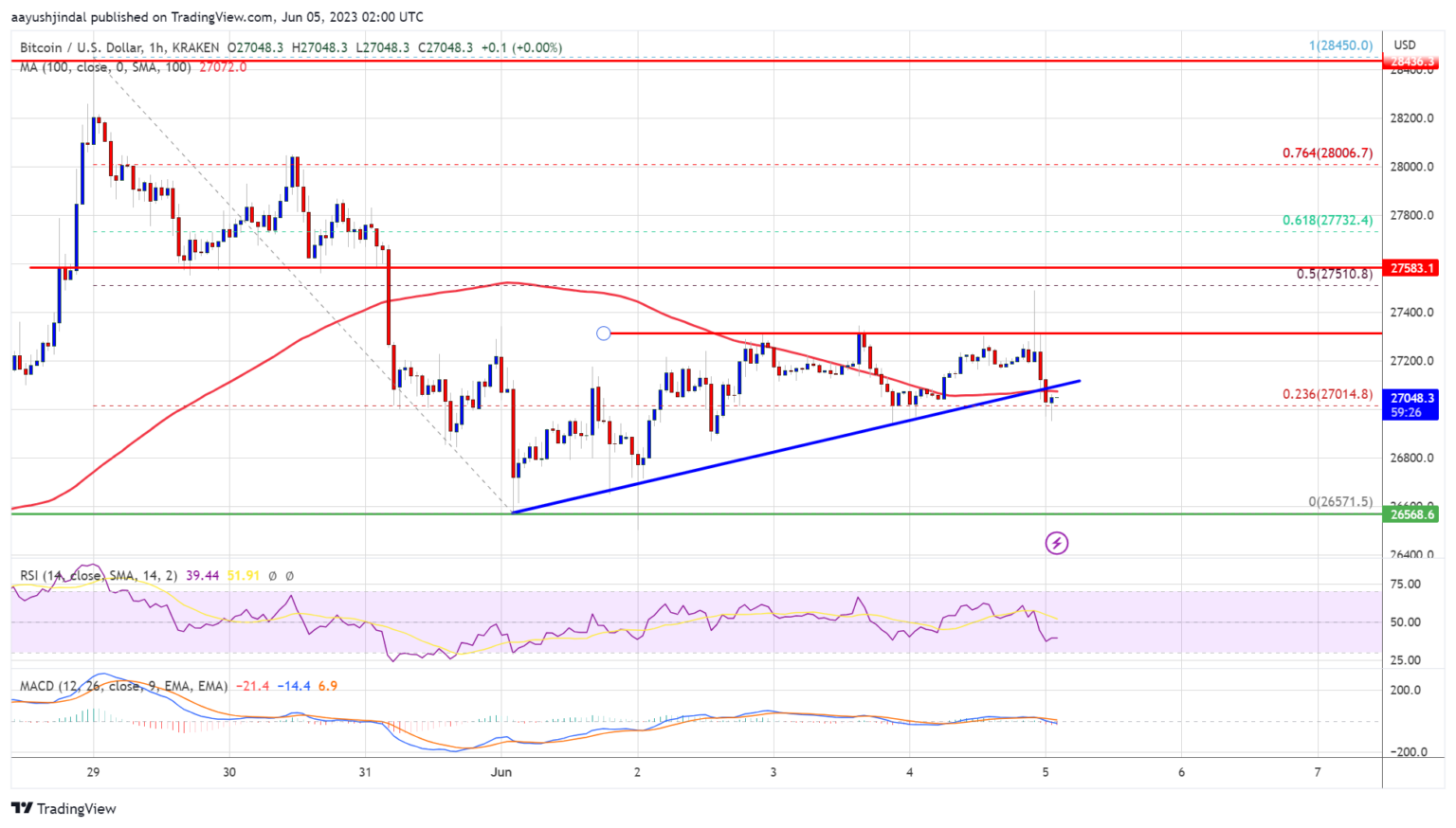 - Bitcoin is still struggling to stay above the $27,000 support zone.