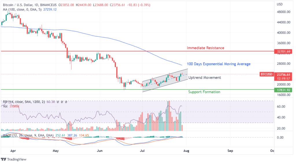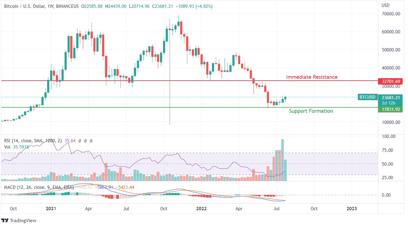 The transactional volume should be considered a strong indication of the change in the hands of BTC tokens. Be it for staking or booking profits; this action has given birth to the increase in BTC token value. The previous week faced resistance at the top, resulting in an upper shadow; despite beginning negative, the current week managed to emerge victorious, pushing the Bitcoin value above $24000 for the second time since June 13.