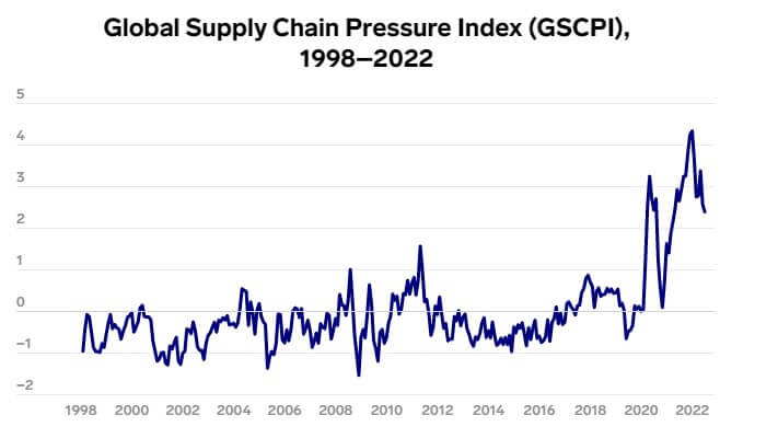 However, an indicator posted by Business Insider indicates that pressure on the supply chain may be reducing. Pressure has been falling since the start of 2022 after reaching an all-time high at the end of 2021. Should problems with sourcing goods go away, the velocity of money should increase, thus removing stress from other parts of the global economy.