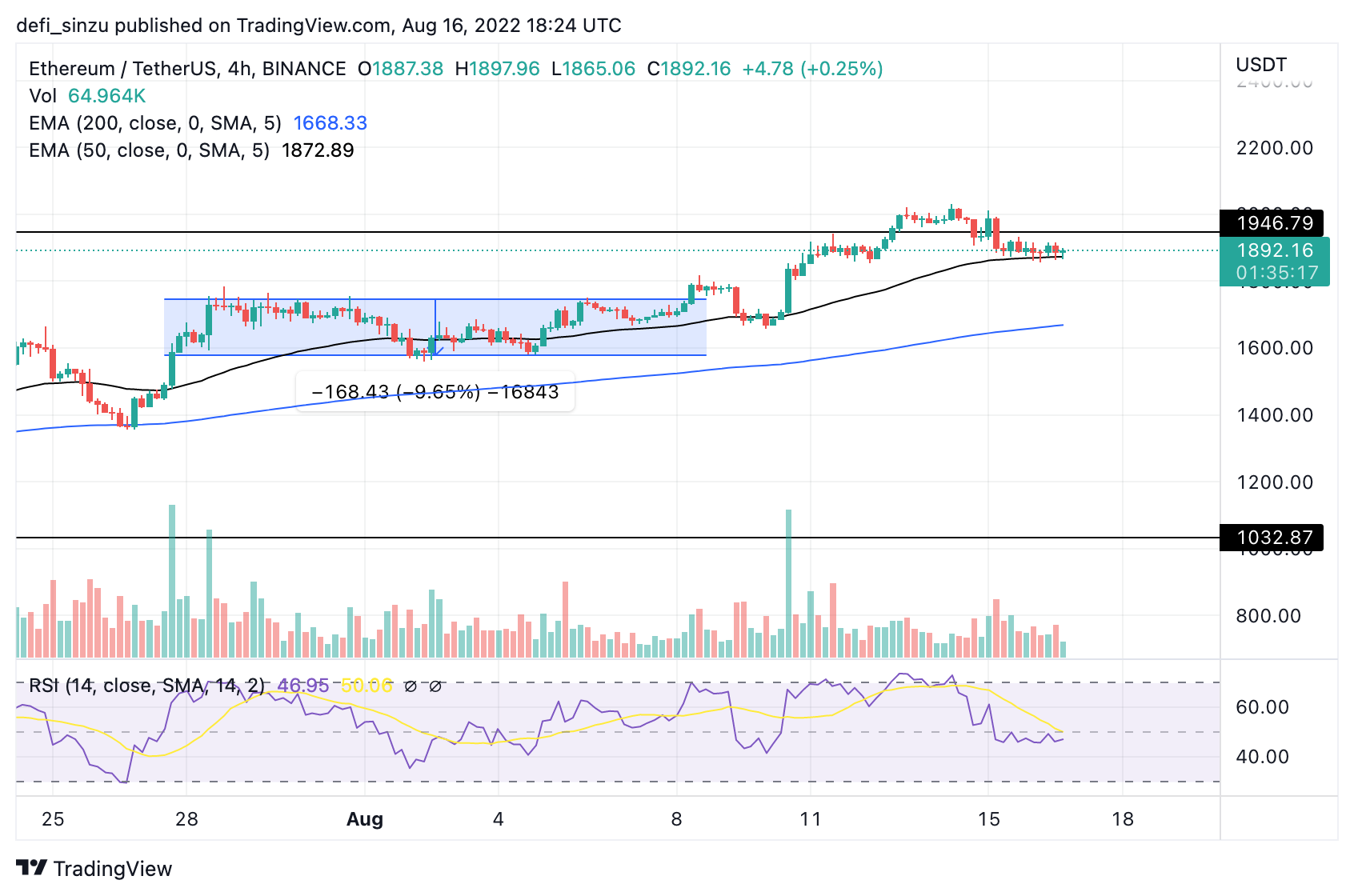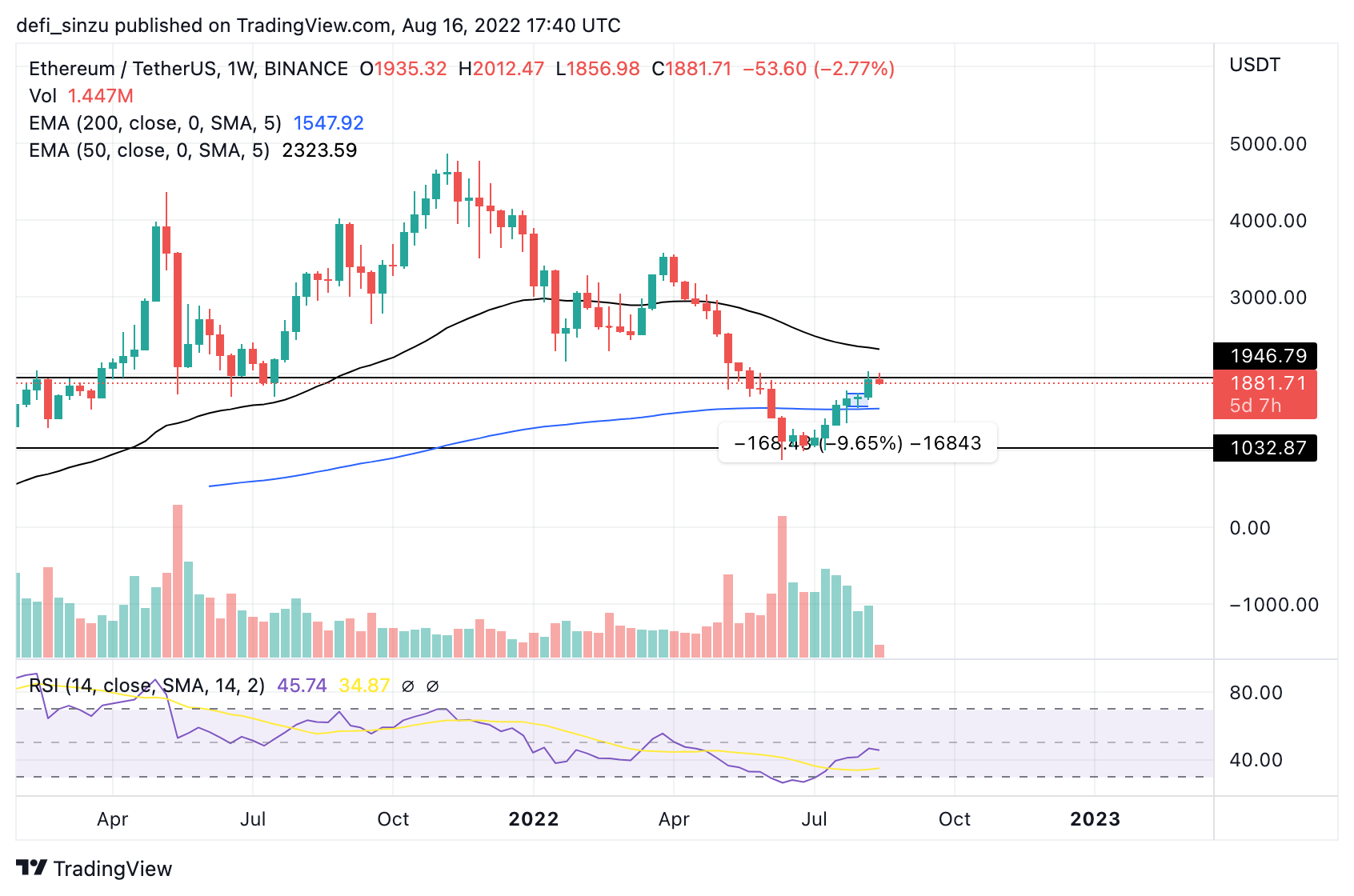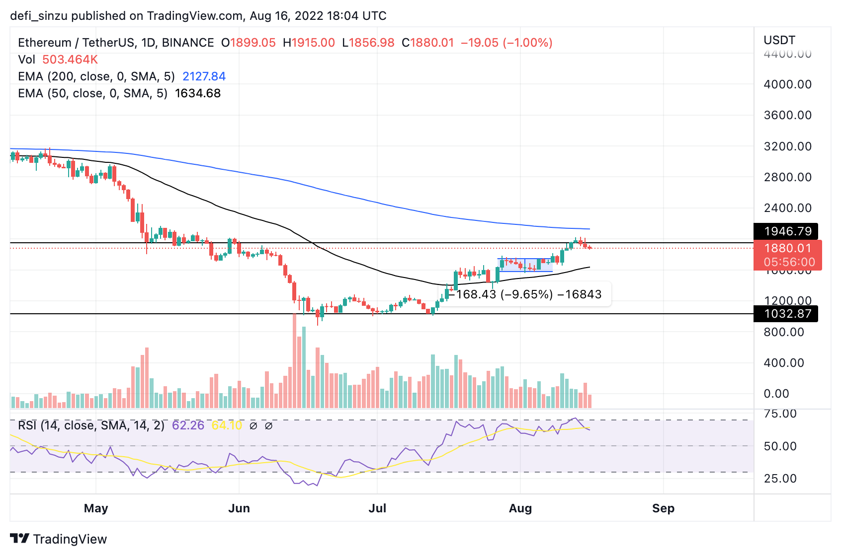 At the point of writing, the price of ETH is at $1,880, narrowly above the 50 Exponential Moving Average (EMA) which corresponds to $1,638.