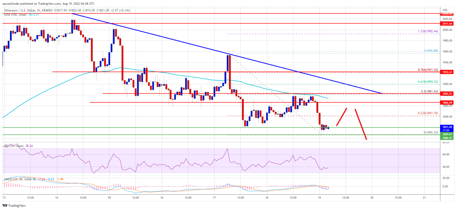 Ethereum followed a bearish path after it settled below the $1,900 level. ETH traded below the $1,850 support zone and increased pressure on the bulls.