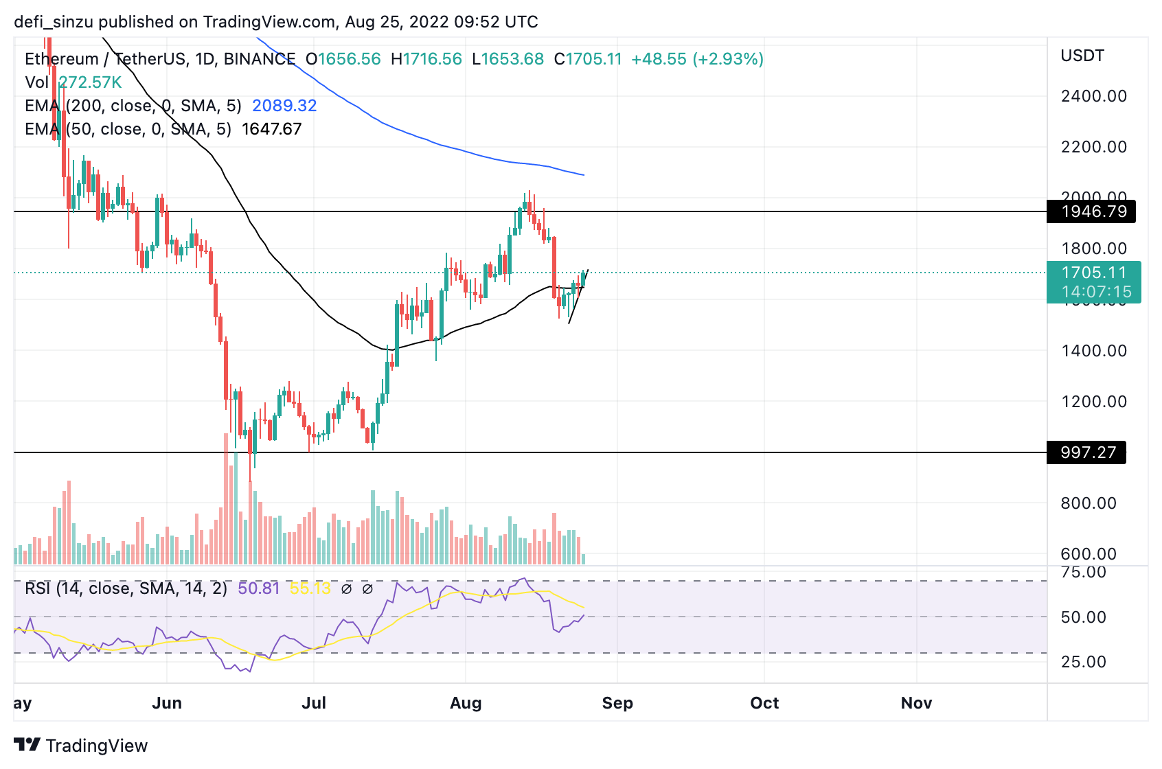 ETH is currently trading at $1,703, just above the 50 Exponential Moving Average (EMA), which corresponds to a price of $1,650 acting as support for ETH.